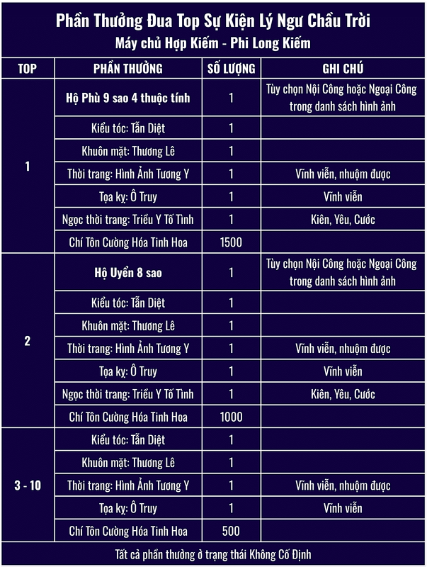 Top 10 bằng hữu có điểm tích lũy cao nhất server sẽ nhận được phần thưởng theo từng thứ hạng như bên dưới. Lưu ý: tối thiểu 200 điểm tích lũy mới được xét top tích lũy.